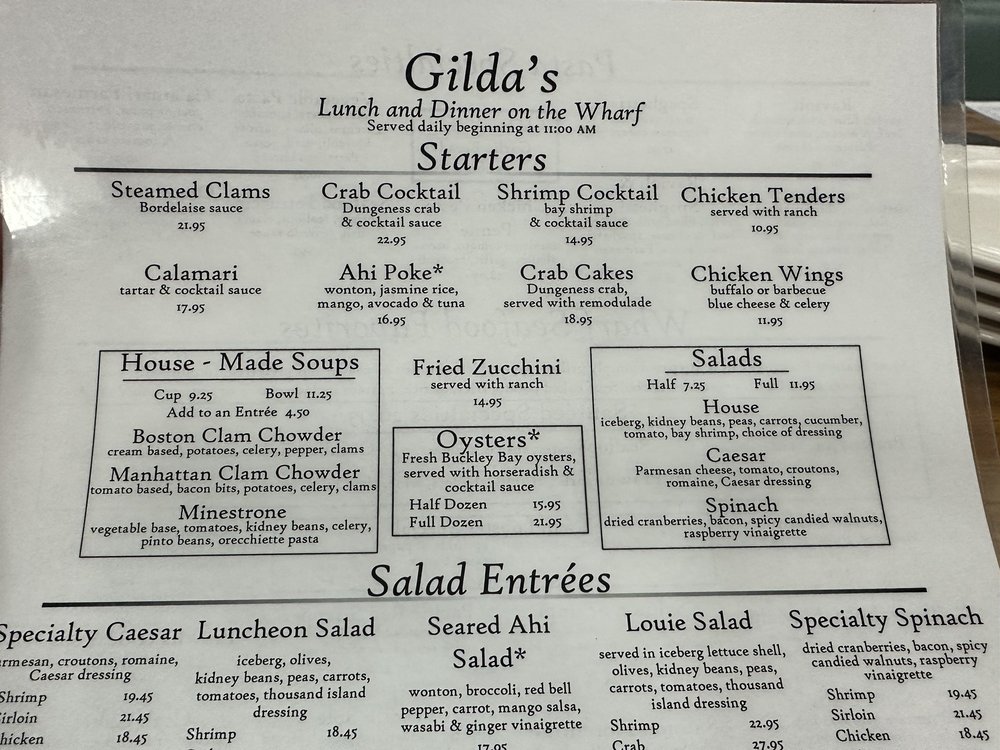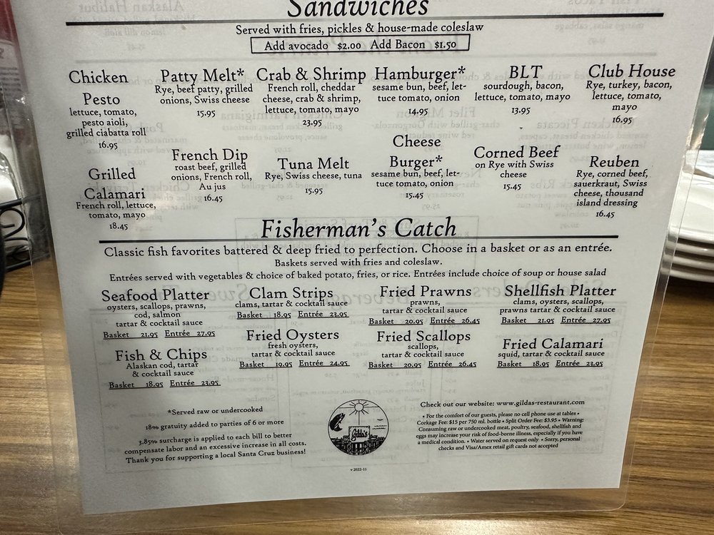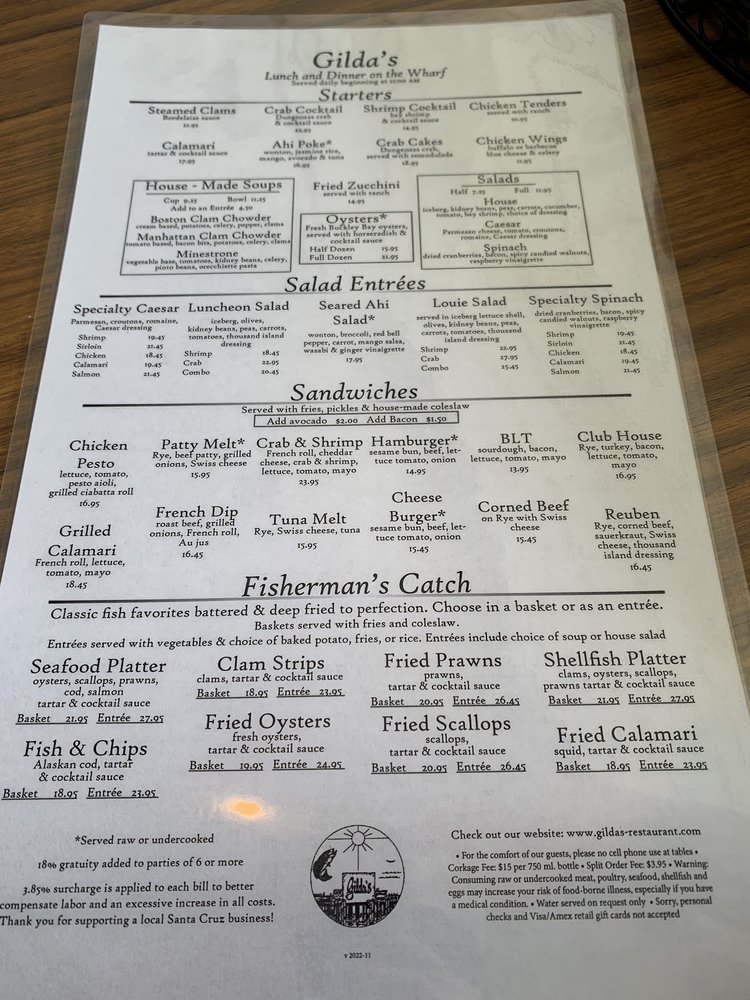 Gilda's Family Restaurant, located in Santa Cruz, CA, offers a diverse menu with options for everyone. From breakfast entrees like New York Steak and Eggs to seafood omelets, there is a variety to choose from. Customers have raved about the prime rib, fresh seafood, and hearty cioppino. The atmosphere is casual and family-friendly, with good service and a beautiful view of the sea lions and whales. Despite some minor mix-ups with orders, the staff at Gilda's goes above and beyond to ensure customer satisfaction. The food is well-prepared, with dishes like fish and chips, Jambalaya, and perfectly cooked poached eggs receiving high praise. Overall, Gilda's Family Restaurant is a must-visit spot for a delicious meal with a view.